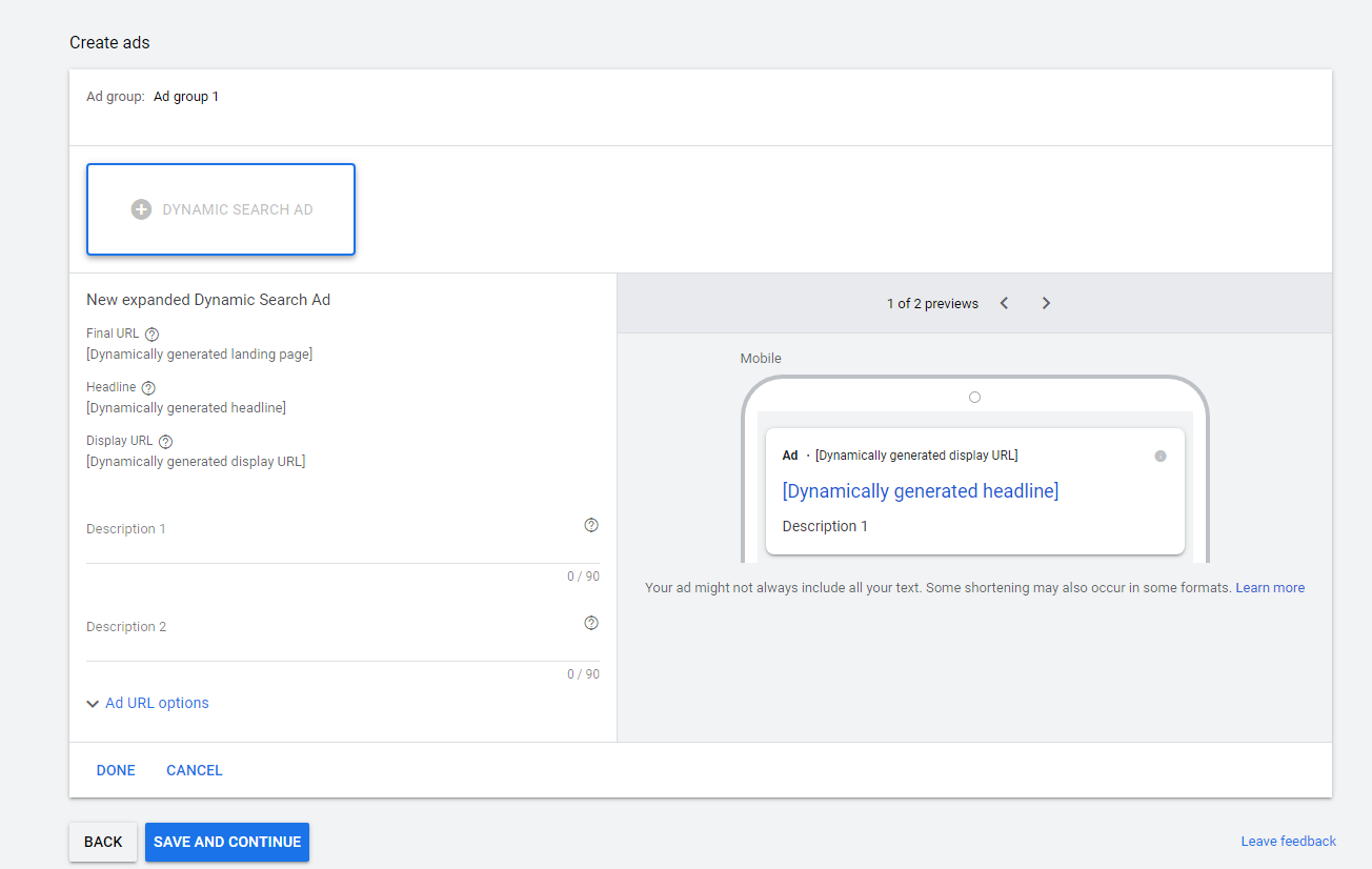 Voila – you created your first Dynamic Search Ad campaign.